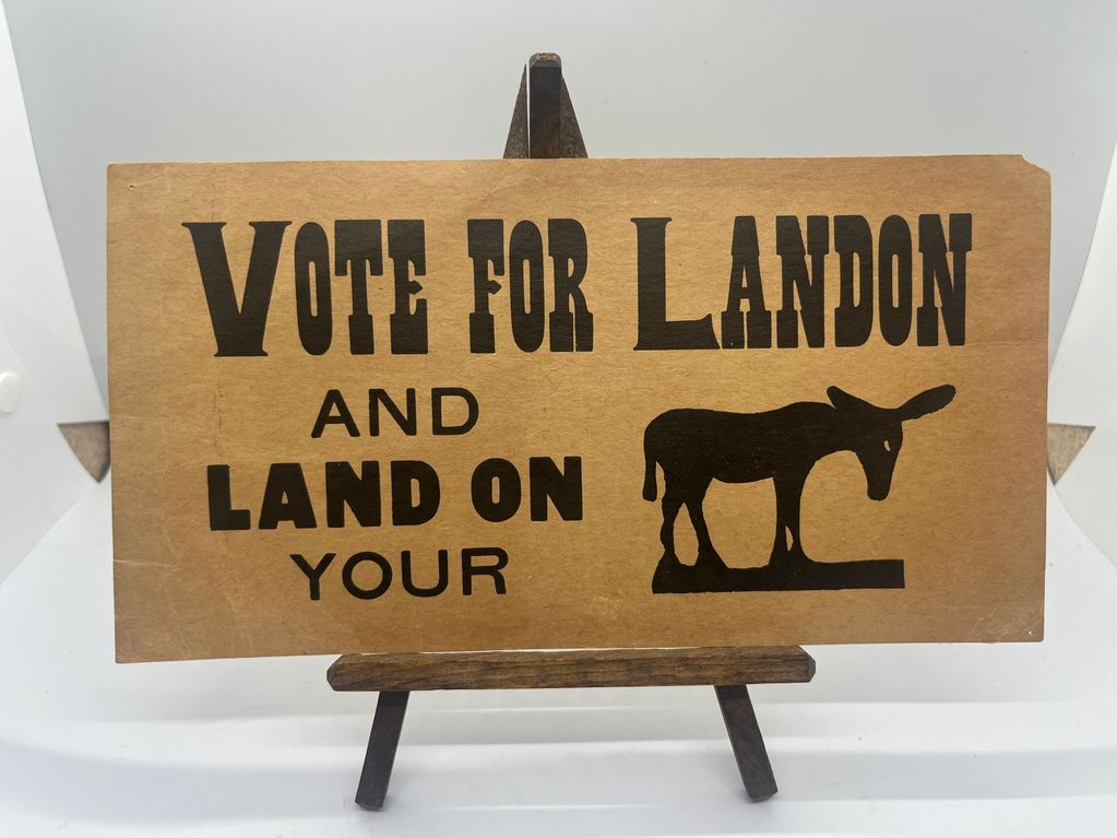 Description:  9.5"x5" Printed Sign Anti-Alf Landon  VOTE FOR LANDON AND LAND ON YOUR (Ass- Donkey Image) rebus