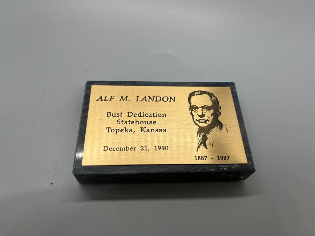 Description: Granite and Copper Plate Paperweight: "ALF M. LANDON Bust Dedication Statehouse Topeka, KS December 21, 1990" 1887-1987